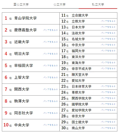 私立大学人气榜单中的第一名仍然是青山学院大学,第二名是传统强校庆应义塾大学,第三名则是近畿大学。