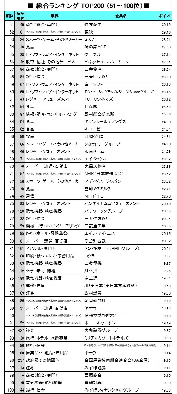 3. 金融公司的排名提高。去年仅三菱日联银行一家企业入选“最受欢迎的100家企业”。今年三家大型银行企业都被评选进了前100。
