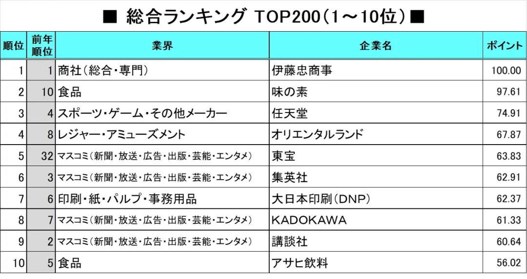 2.“伊藤忠商事”10年来一直保有人气,10年间一直保持在“就业人气企业排行榜”上前10名,能蝉联这么久的企业仅此1家。