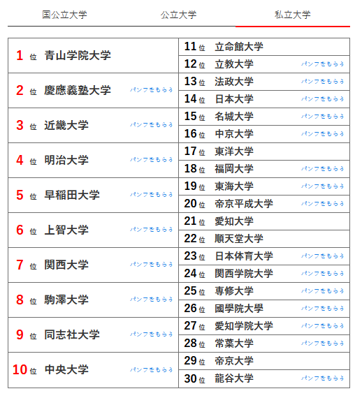 2025年1月JS Corporation公布了日本的“大学人气排名”榜单。195536名日本高中生参与了该排行榜的投票。投票从2022年4月开始,一直进行到2024年12月。