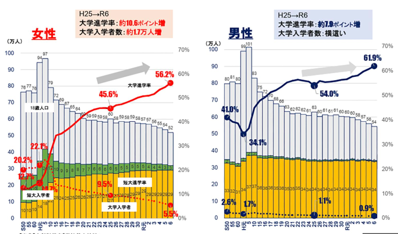 据报道近年来,日本本土大学的升学人数持续增加。虽然18岁人口达到峰值后在持续减少,但大学升学率却不断上升。目前日本的大学升学率已经超过了60%。