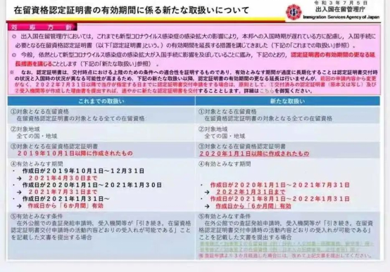 2020年1月1日~2021年7月31日发行的在留资格有效期延长至2022年1月31日。