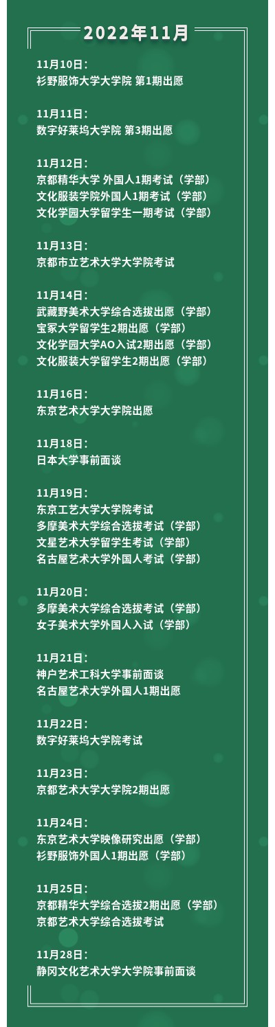11月,日本的各个大学院和学部冬季考都要开始了出愿了。我们汇出了一些艺术院校的报考时间信息,请需要的同学收藏!