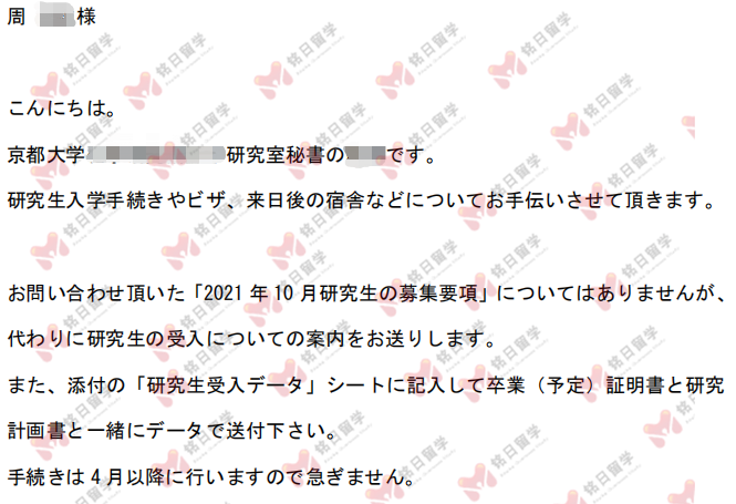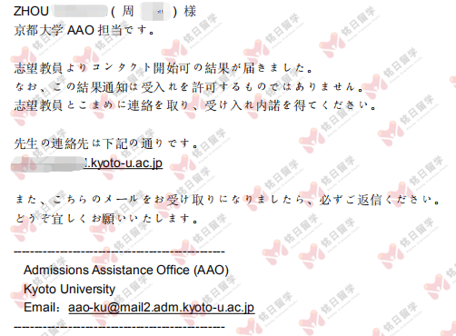 通过日本内部学生的推荐,我们获得了接收留学生研究生的导师名单。和周同学沟通方向之后确定了A导师。接下来,老师们协助学生一起反复修改计划书,顺利通过了京都大学AAO的审查。