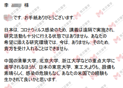 李同学在美国本科学习成绩优秀,非常不幸在大三下学期遇到了美国疫情大爆发,学期开始不到一半,所有的课都变成了网课,很多科研实验无法进行,这也对申请日本留学有一定影响。于是我们先结合学生的喜好(机械设计,汽车飞机制造方面的研究),开始套磁教授。最开始的套磁,回复邮件并不理想: