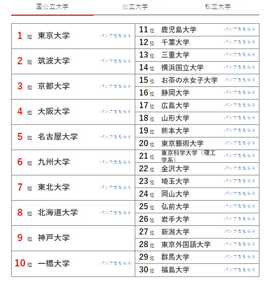 东京大学稳居国立大学排行榜榜首,其次是筑波大学,第三名则是京都大学。