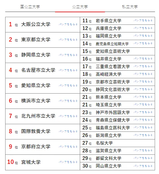 公立大学排行榜榜首是大阪公立大学,其次是东京都立大学,第三则是静冈县立大学。