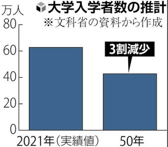 2040年的预测推算,大学入学人数会跌至45万人,比较2021年入学人数为62万人,整整缩减了近17万人。而到了2050年后,预计入学人数会再减到42万人。