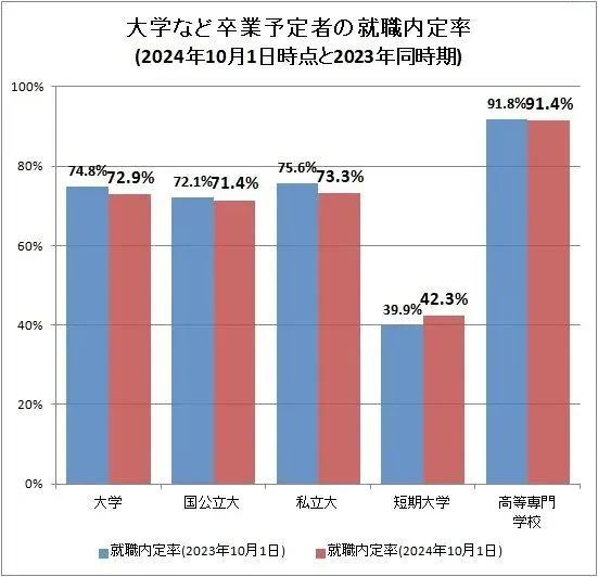 近期,据日本文部科学省和厚生劳动省统计数据显示,日本大学明年春季毕业生内定率为72.9%,相比前一年同期下降1.9%。2021年以后出现了首次下跌趋势。