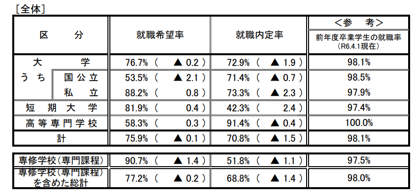 专门学校(专们课程)就业内定率为68.8%,下降1.4%。