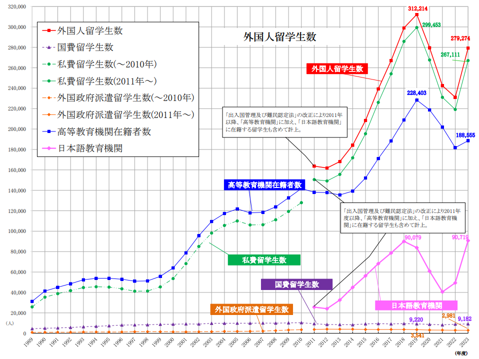 日本学生支援機構(JASSO)统计的2023年度外国人留学生在籍状況如下: