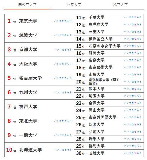 人气第一还是东京大学莫属,其次是筑波大学、京都大学、大阪大学、名古屋大学、九州大学、神户大学和东北大学。