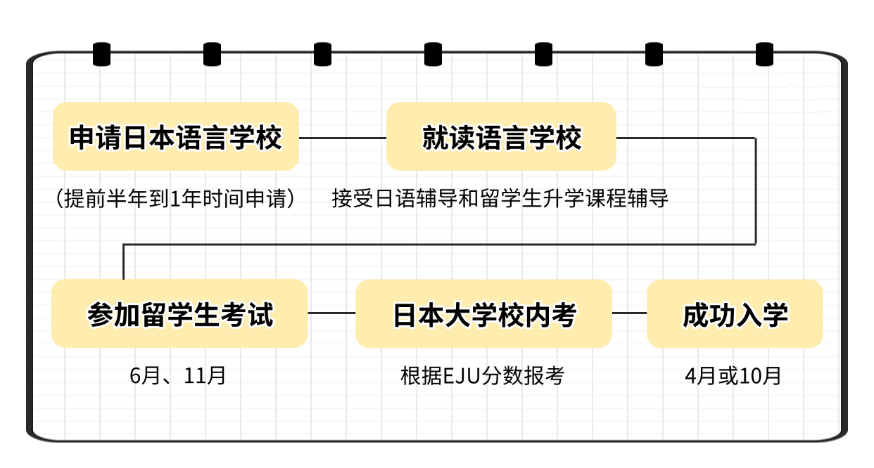 语言学校→EJU(留学生考试)→校内考→升学日本大学