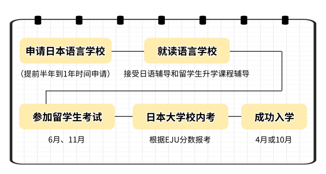 中国学生想要去日本读大学,由于很多同学在出国前语言方面还是有瓶颈的。因此,可以先去日本的语言学校,经过1-2年的日语课程辅导和升学课程辅导,再参加日本的留学生考试(EJU)和日本大学校内考,考试合格后便可以完成入学啦。