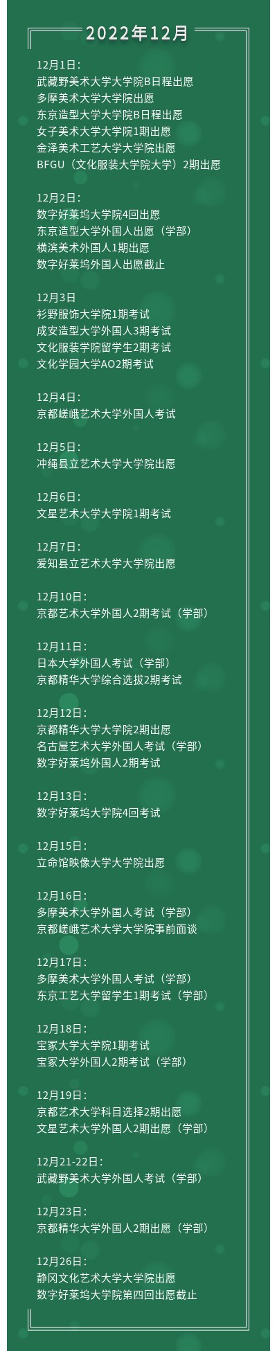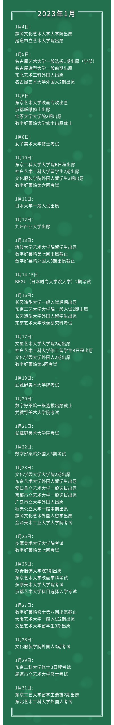 11月,日本的各个大学院和学部冬季考都要开始了出愿了。我们汇出了一些艺术院校的报考时间信息,请需要的同学收藏!