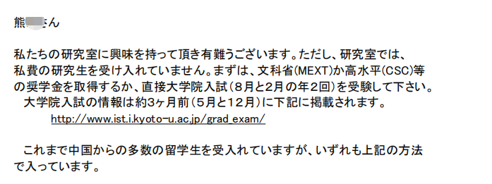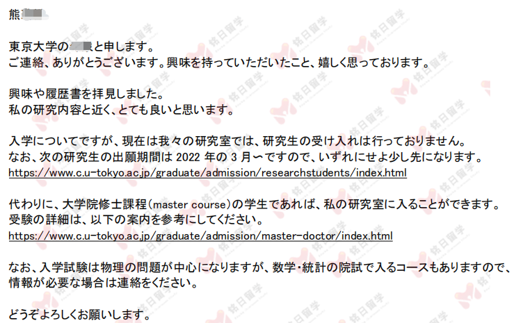 熊同学学习成绩优秀,英语水平也非常高,目标院校:东京大学、京都大学、大阪大学三所学校。我们最先申请东京大学,经过多次的申请套磁,回信并不理想,导师目前不收研究生,只可以直接参加修士考试。