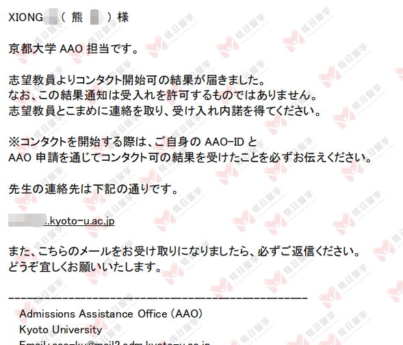 经过精确定位,确认了京都大学的导师。不过,导师的研究方向并不是学生最喜欢的课题。熊同学考虑再三,决定先拿下京都大学的这个导师作为保底。于是我们经过计划书书指导和AAO流程审查,终于拿到了AAO审查合格,并且经过和导师的面试套磁,最终获得了京都大学内诺。